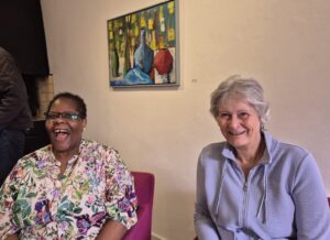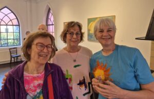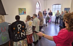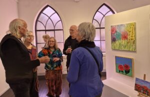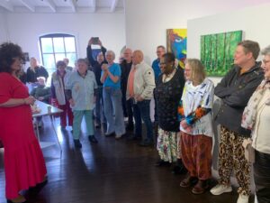 We mochten vele bezoekers verwelkomen en een verlate gast nam haar intrede na het openingspraatje van de galeriehoudster; zij was nogal verbolgen over het feit dat wij als leden nog ons schilderskloffie aanhadden. “We hadden toch afgesproken om kleurrijk en netjes te komen?” Later bleek dat alle leden op hun rug enkele letters hadden staan en dit een puzzel bleek die opgelost moest worden. Met behulp van enkele toeschouwers lukte dit uiteindelijk.